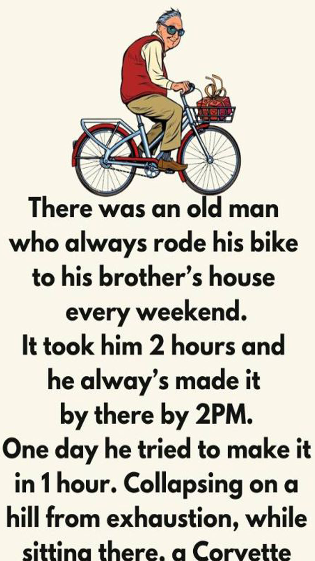 Just then, a shiny Corvette pulls up beside him. The driver rolls down the window and asks, “Need a ride, old timer?”