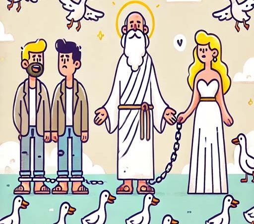 ? “Your punishment for stepping on a duck is spending eternity chained to her,” he says, locking them together.