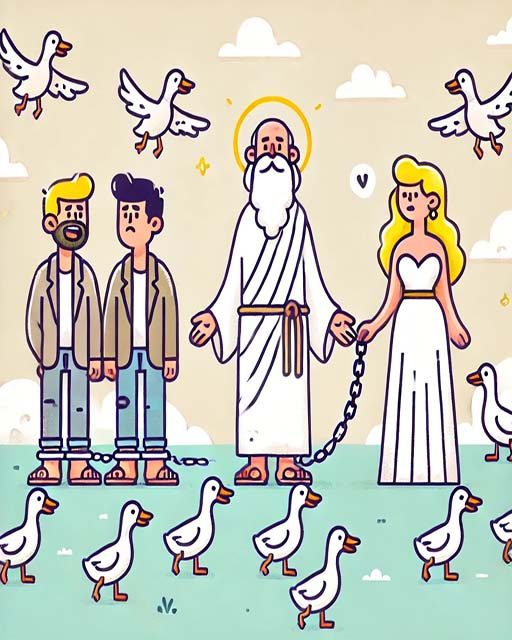 ? “Your punishment for stepping on a duck is spending eternity chained to her,” he says, locking them together.