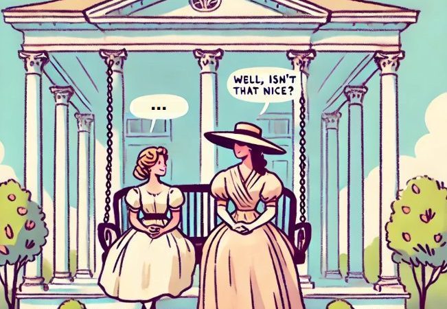Two Southern belles—one from Mississippi, the other from Texas—sat rocking on the porch of a grand white-columned mansion.