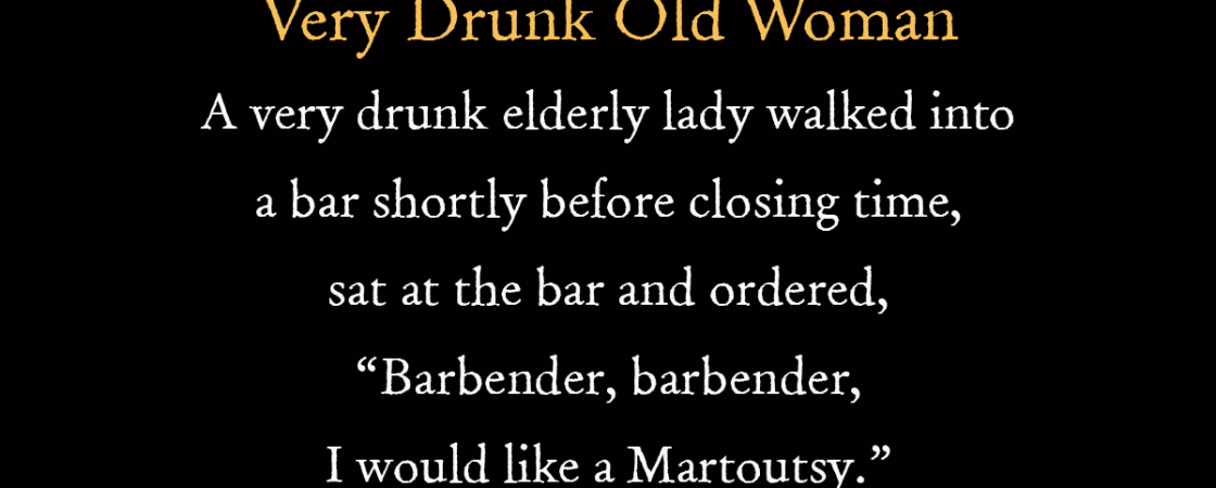 An elderly lady, feeling a little too festive, stumbles into a bar just before closing time. She wobbles onto a stool and slurs,