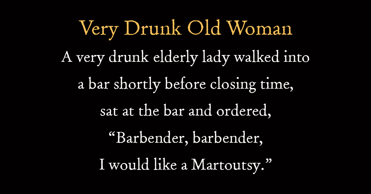 An elderly lady, feeling a little too festive, stumbles into a bar just before closing time. She wobbles onto a stool and slurs,