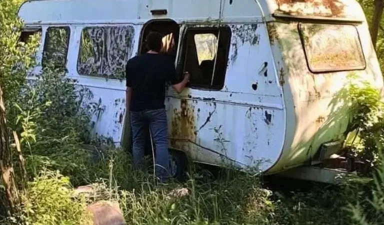 And there it was—a rusted old trailer, partially concealed among the trees.